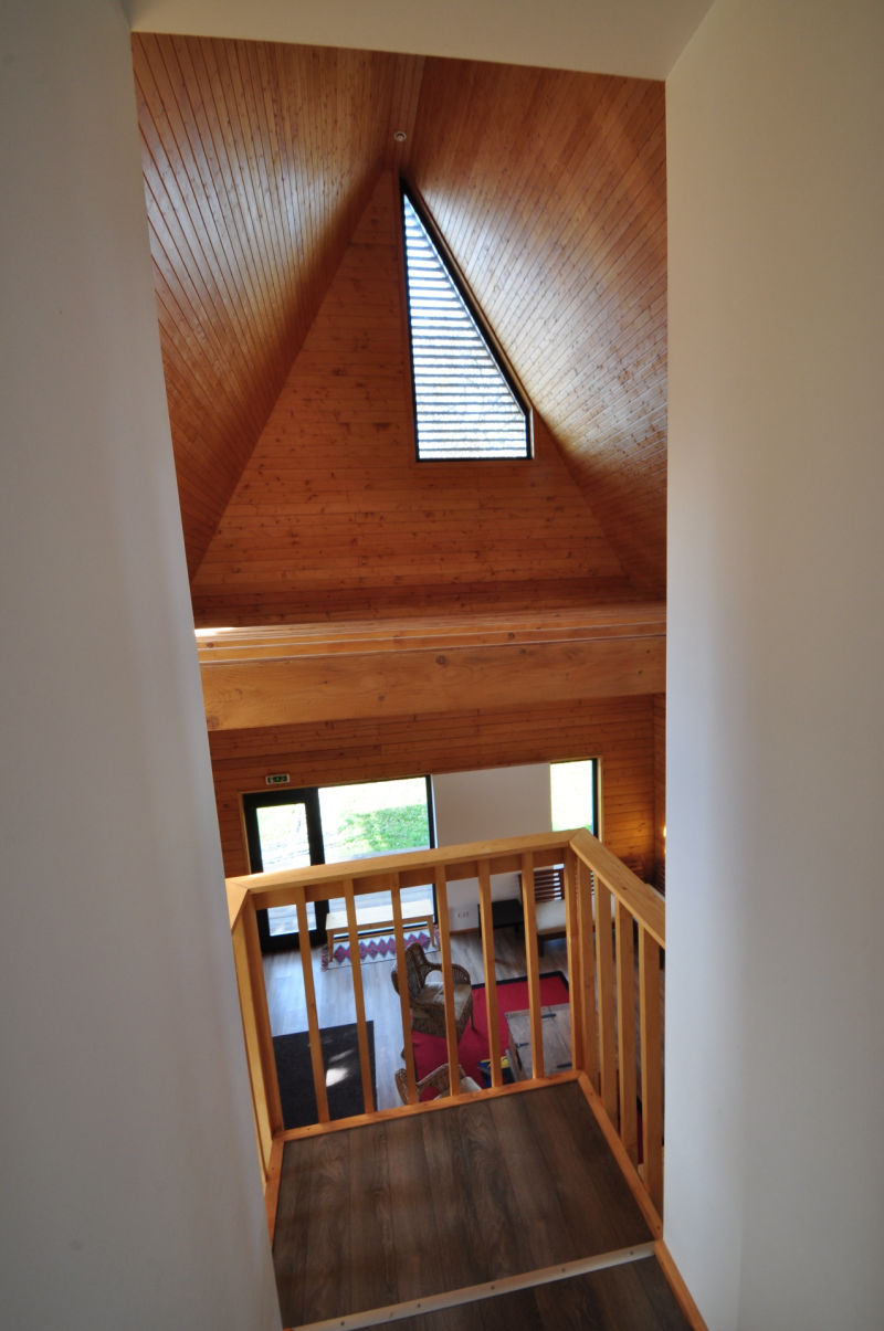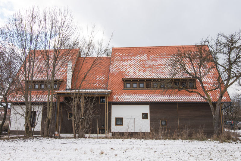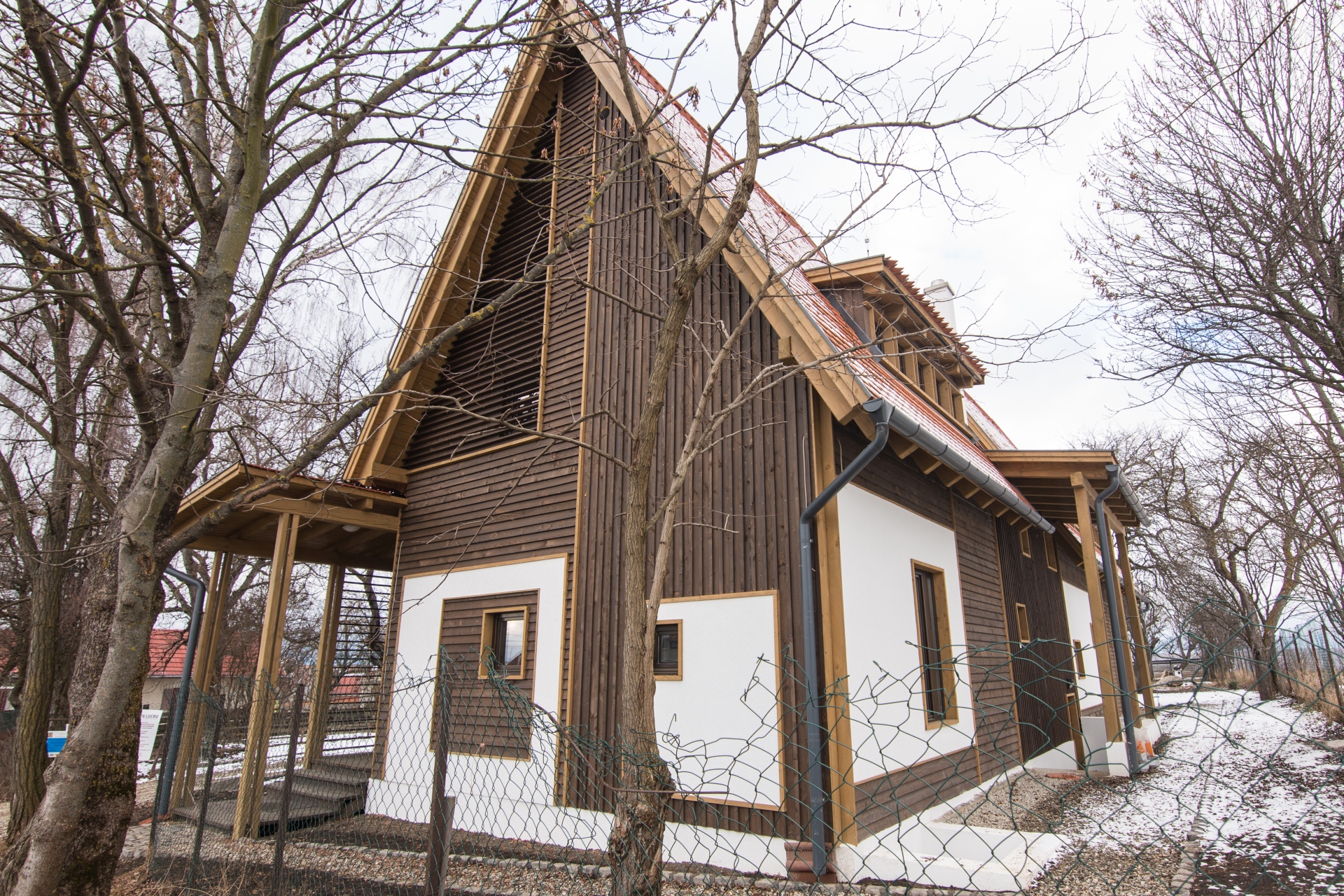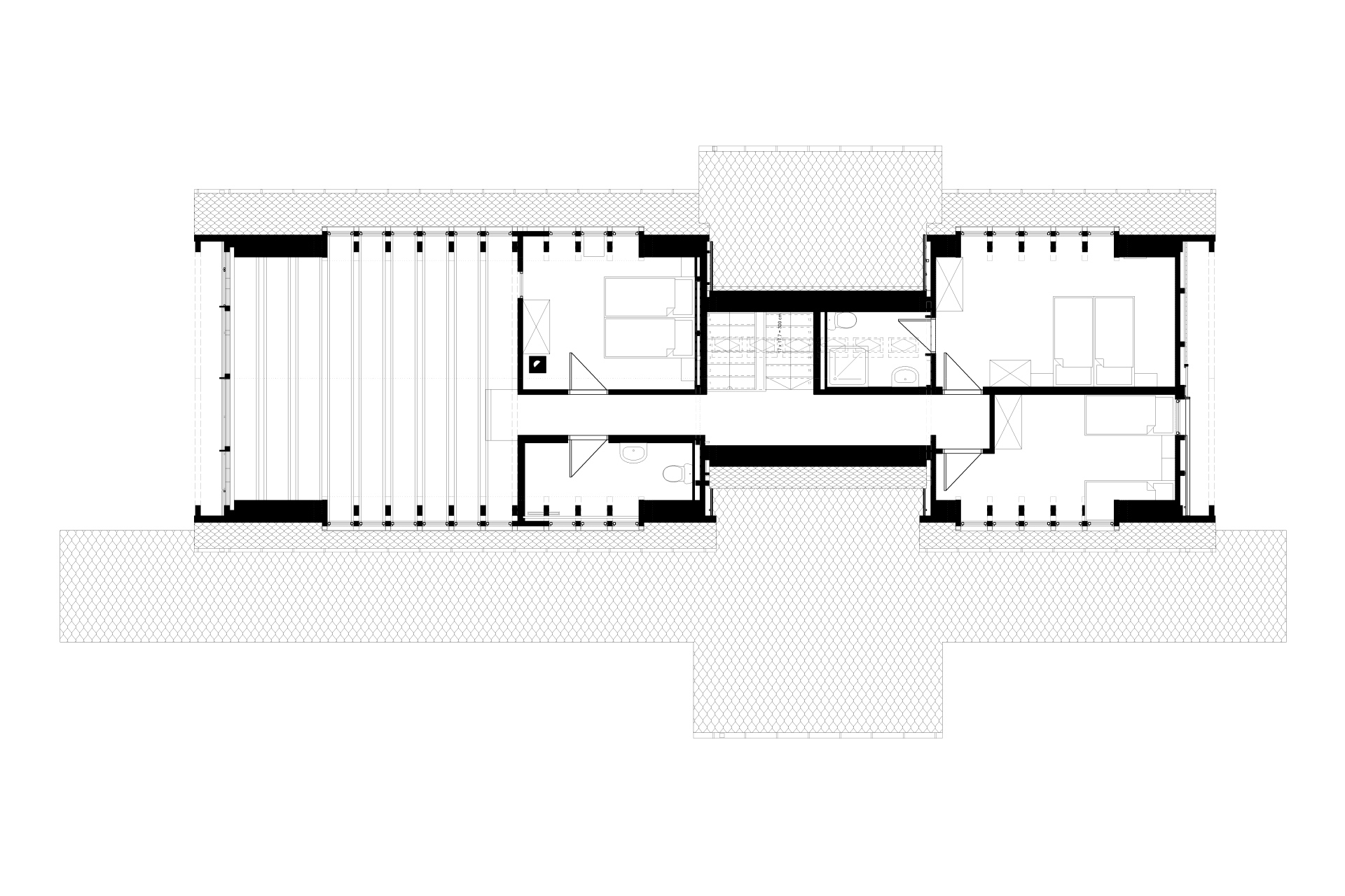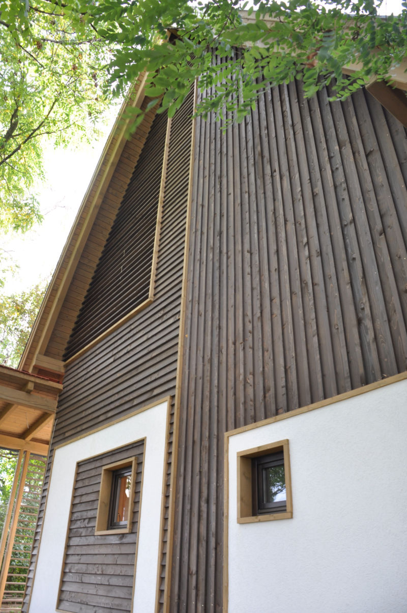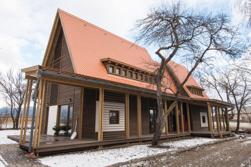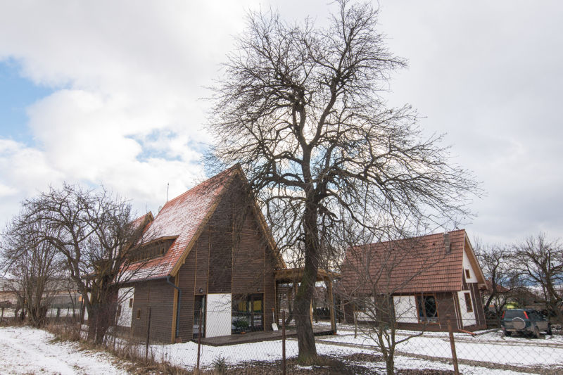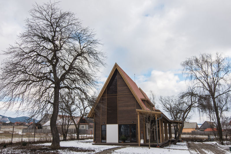 The high-pitched roof,the white rendered fields surrounding the facade openings and the playful wooden textures of the house's skin are trademarks of local vernacular architecture. The large articulated roof planes dominating the