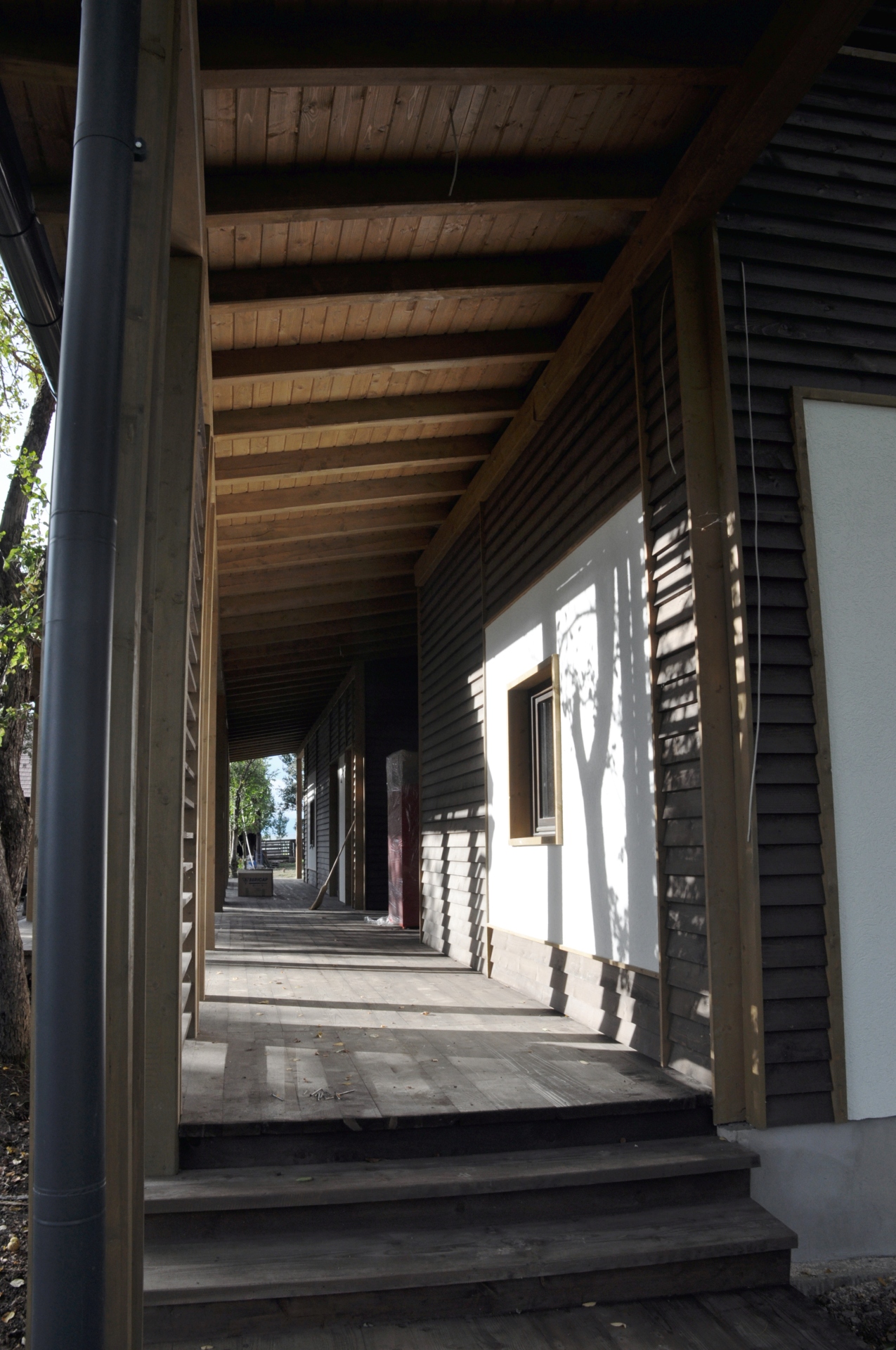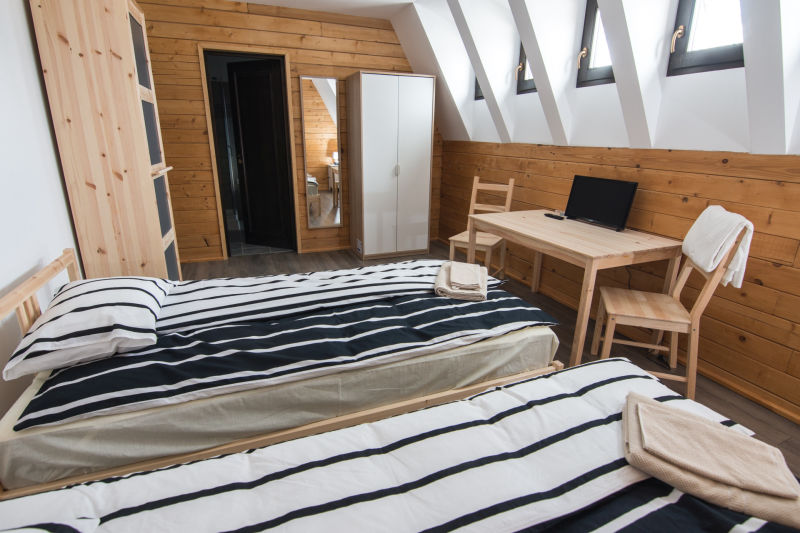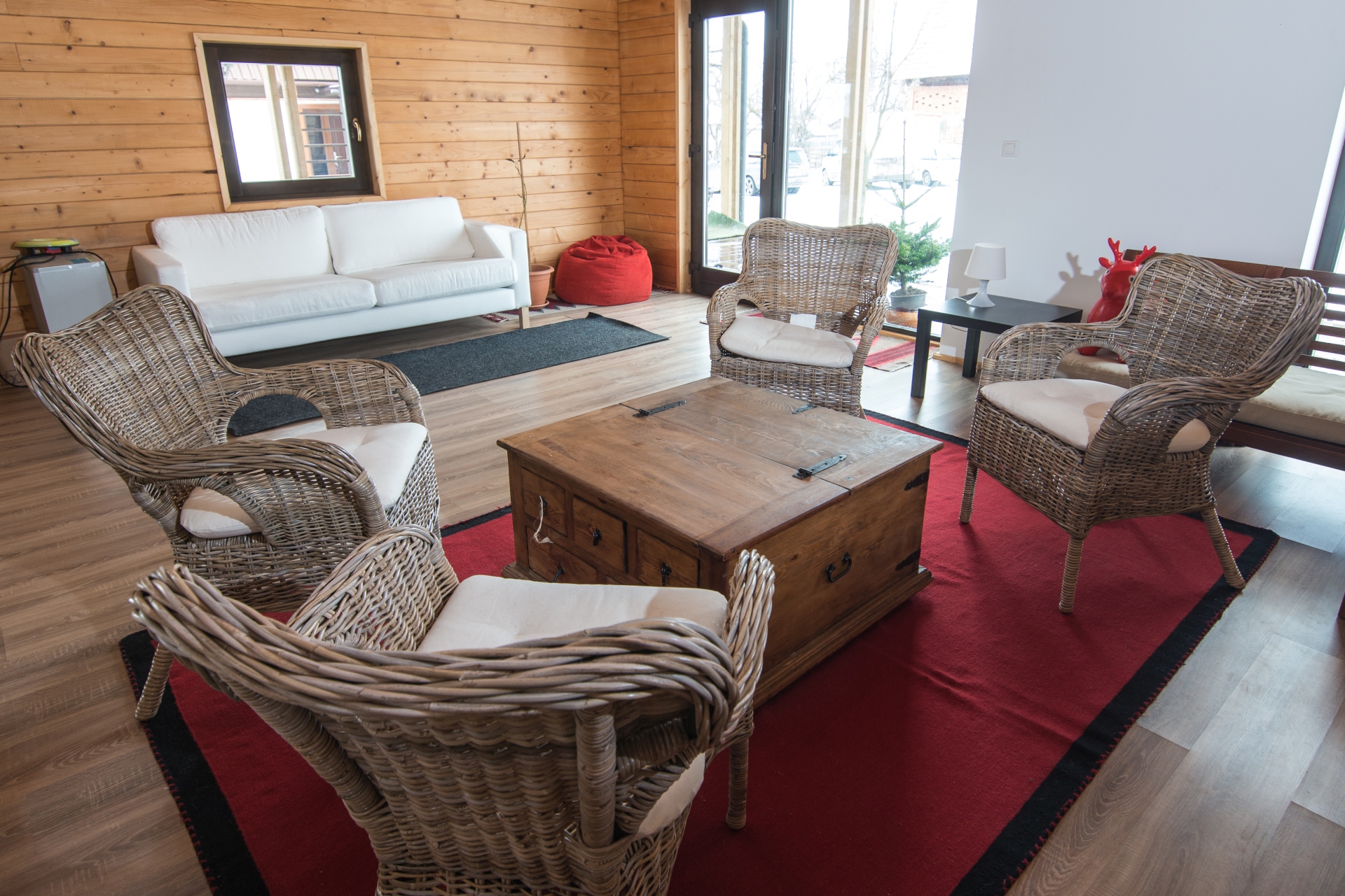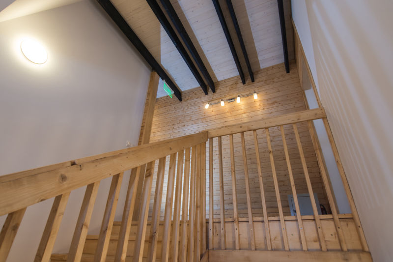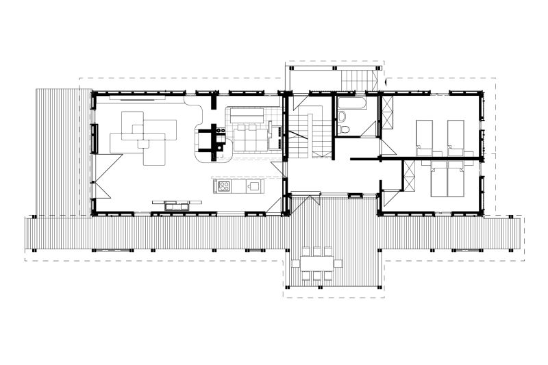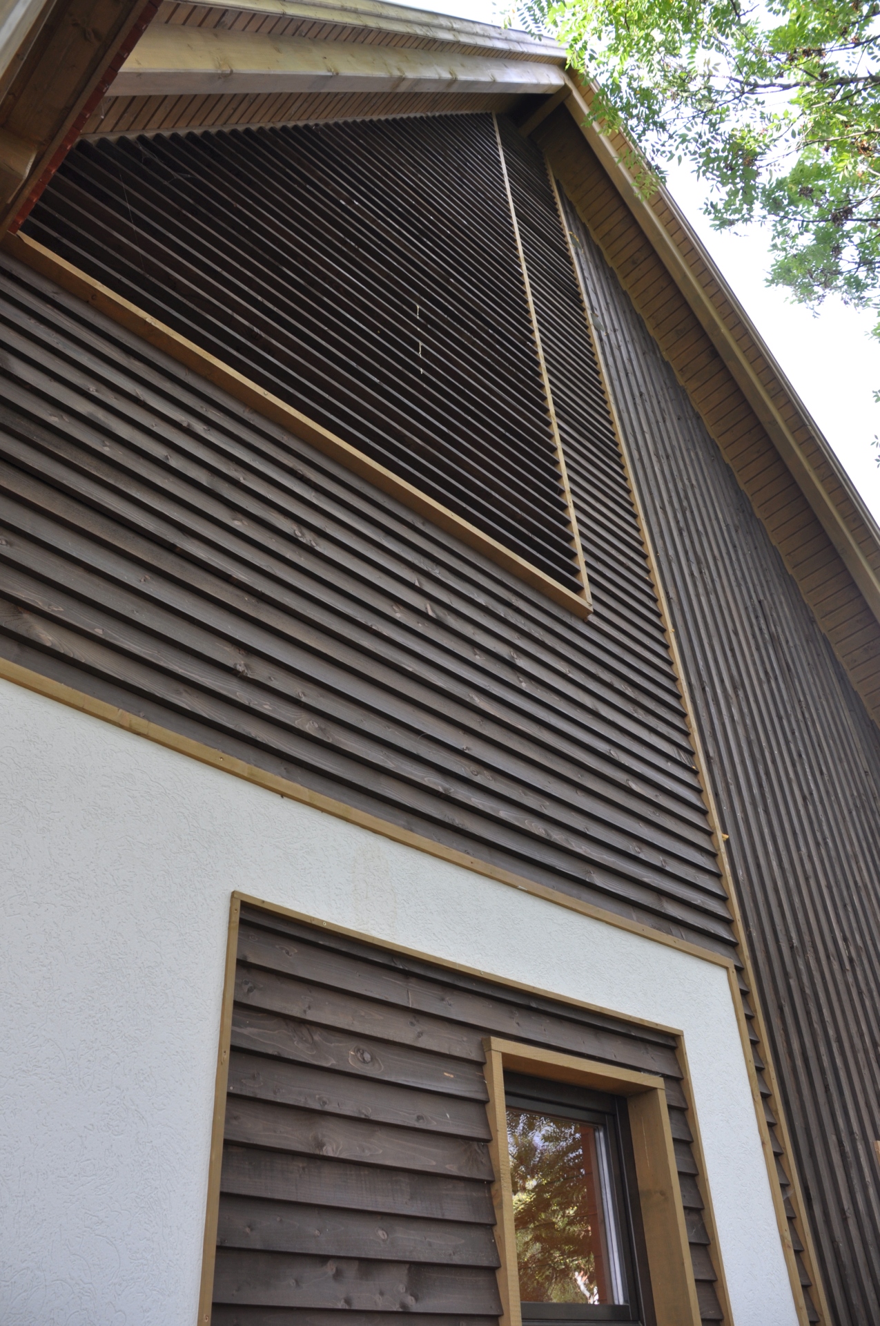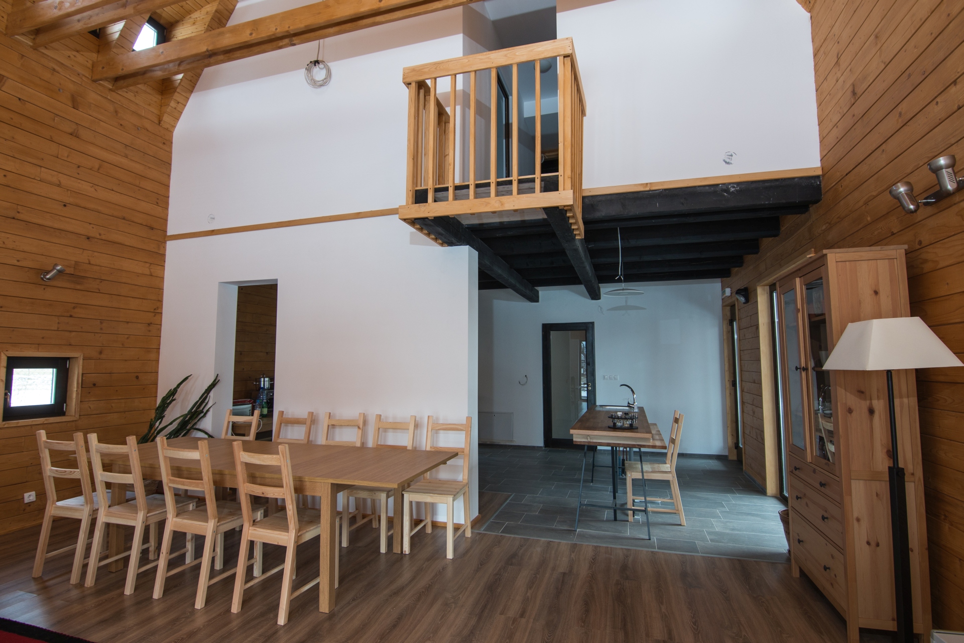 The high-pitched roof,the white rendered fields surrounding the facade openings and the playful wooden textures of the house's skin are trademarks of local vernacular architecture. The large articulated roof planes dominating the