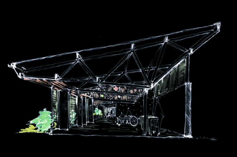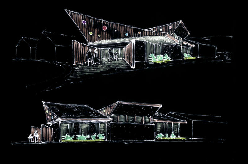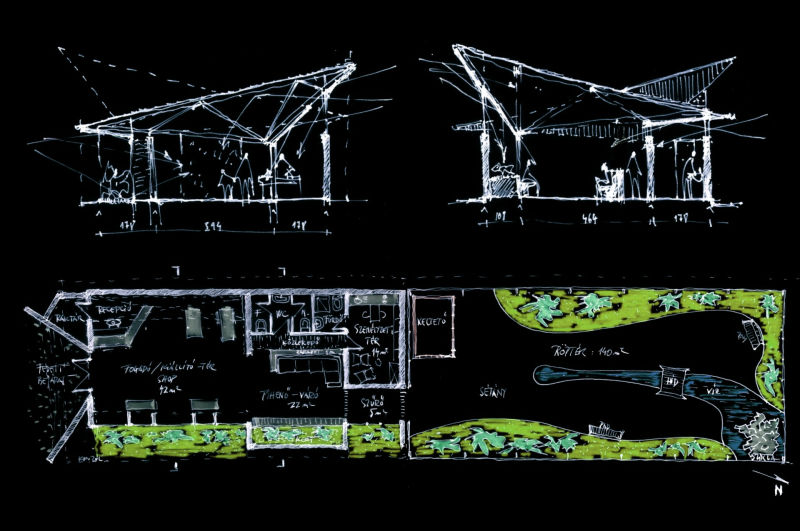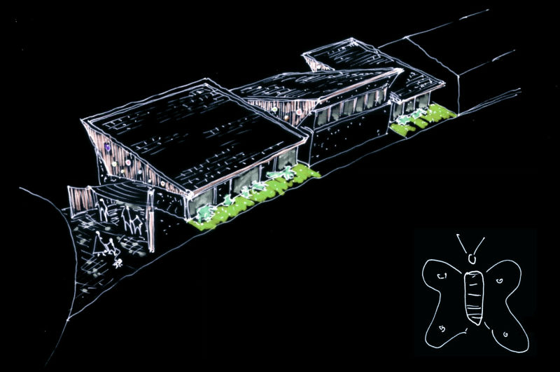 Somewhere between a showroom and the entrance pavilion of the Zoo was lays the theme concerning a reception-building for the Butterfly House, showing the tourists a whole suite of live exotic butterflies. Reception and waiting area, café, souvenir shop, as well as auxiliary spaces are integrated under the flying roof, built of pre-assembled timber trusses, hiding the neutral secondary building, the butterfly enclosure, dimensioned for a maximum of 25-30 simultaneous visitors.