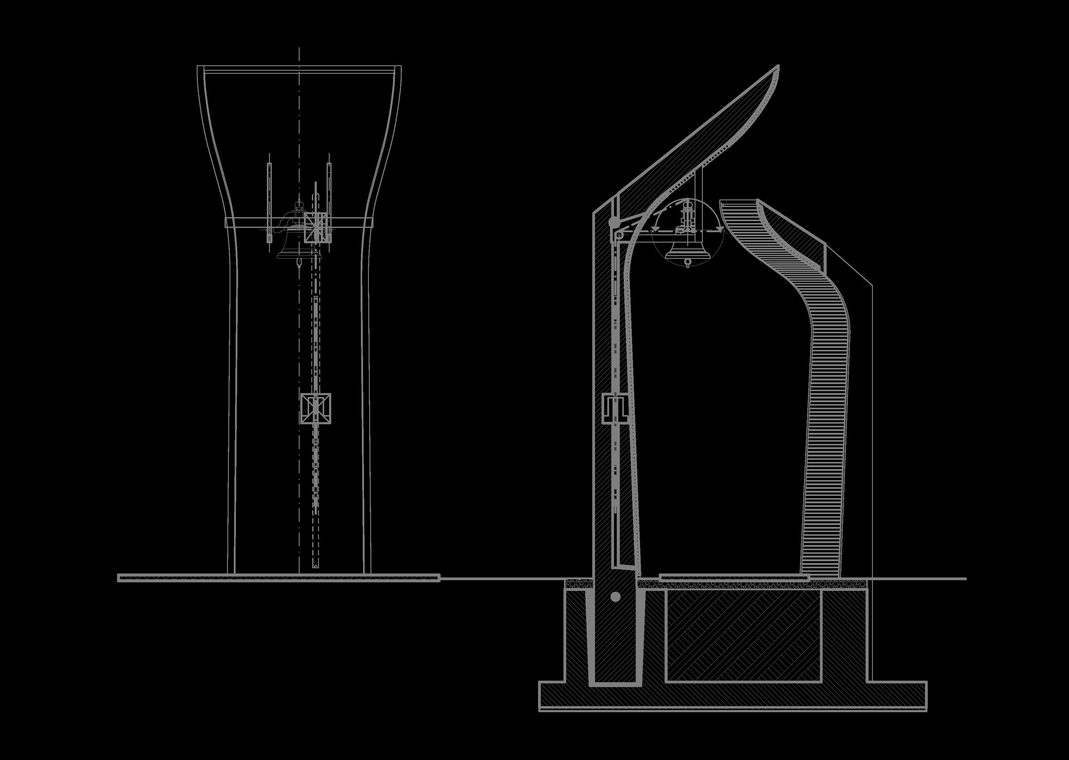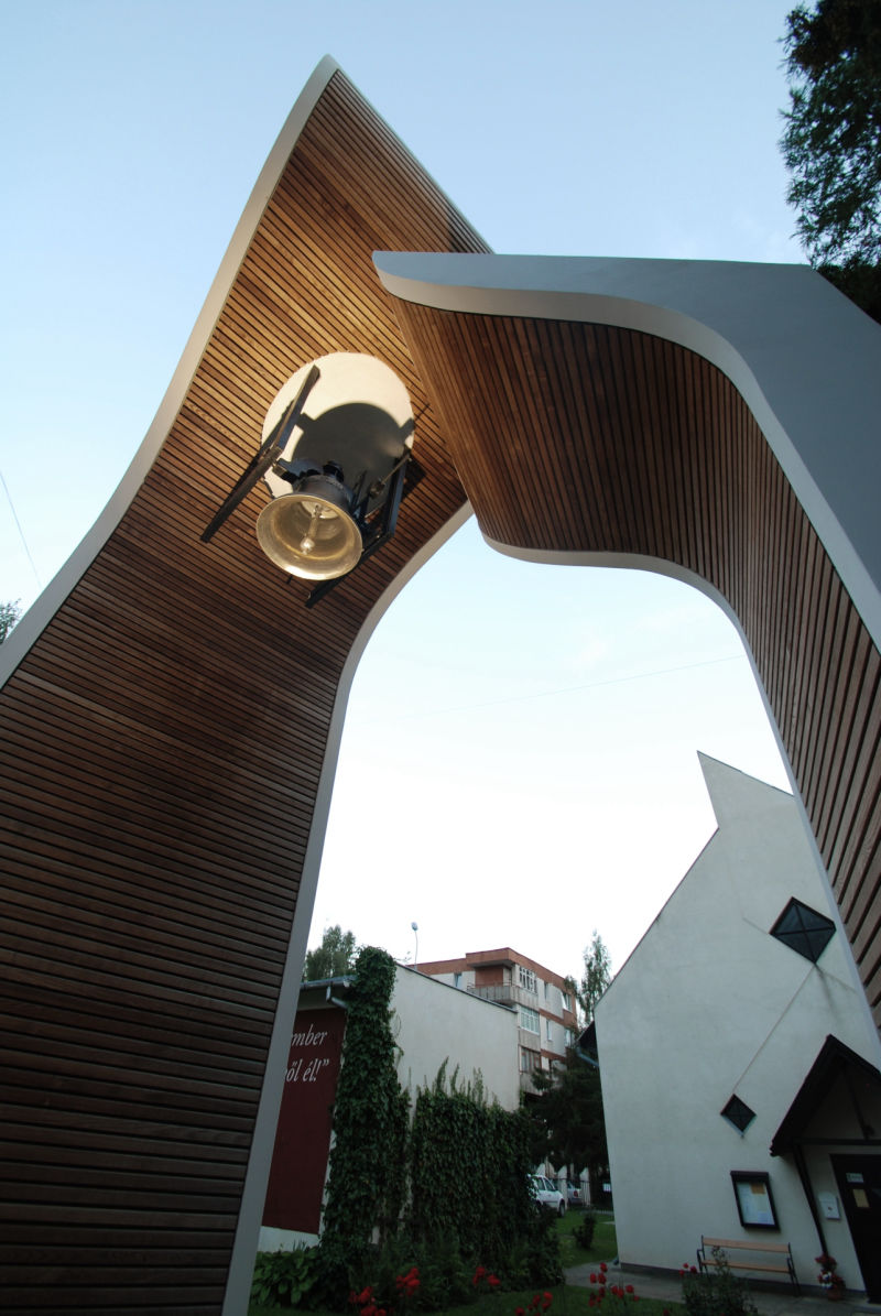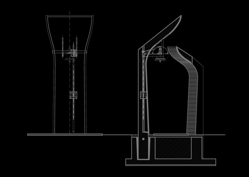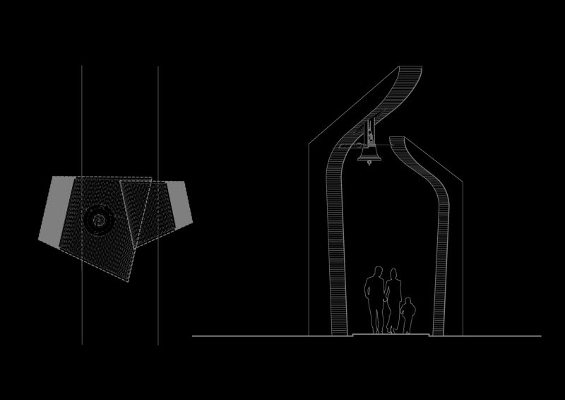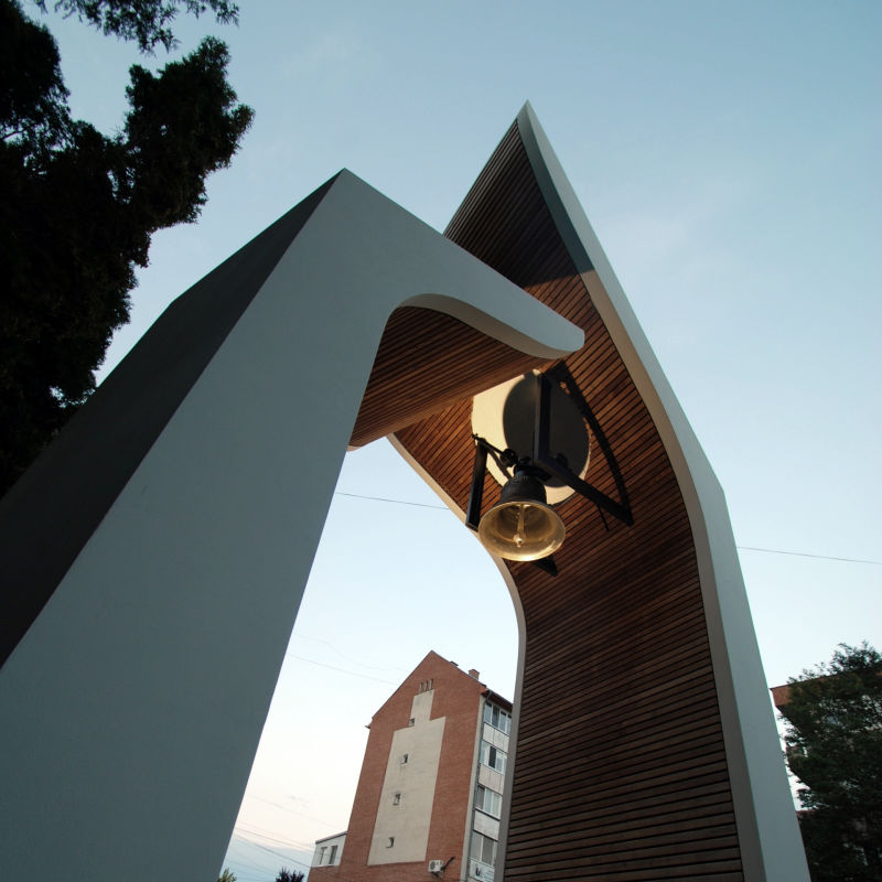 In a scarcely sacred context, adjacent to a reformed church building born in the '90s from the conversion of an abandoned heating plant, the flock has been longing for a steeple housing their newly manufactured bell. The models offered by local building traditions of timber steeples placed on top of the hill in the rural area were of no use amidst of the densely built residential quarter, raised upon the minimum standards of public space as defined in the '80s. The final response has been incarnated in a composition of two sculptural monoliths forming the gate towards the sacred ground of the churchyard.