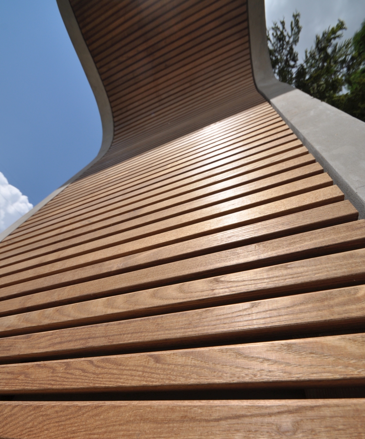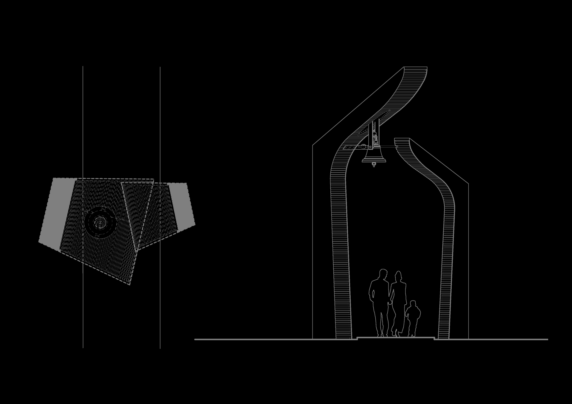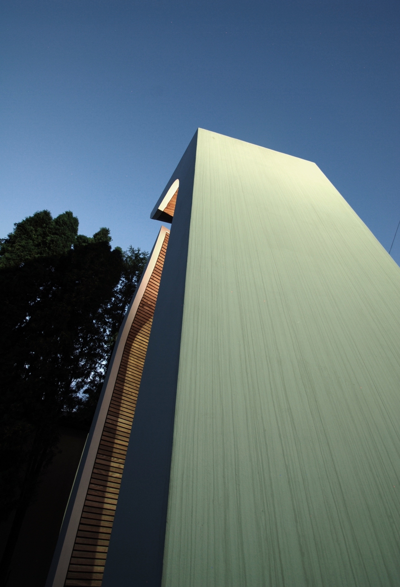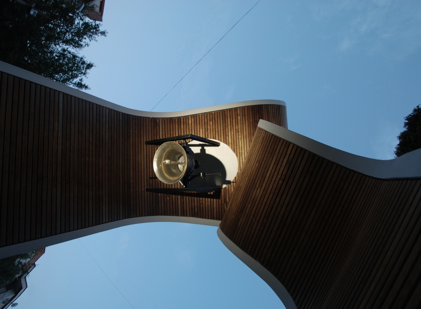 In a scarcely sacred context, adjacent to a reformed church building born in the '90s from the conversion of an abandoned heating plant, the flock has been longing for a steeple housing their newly manufactured bell. The models offered by local building traditions of timber steeples placed on top of the hill in the rural area were of no use amidst of the densely built residential quarter, raised upon the minimum standards of public space as defined in the '80s. The final response has been incarnated in a composition of two sculptural monoliths forming the gate towards the sacred ground of the churchyard.