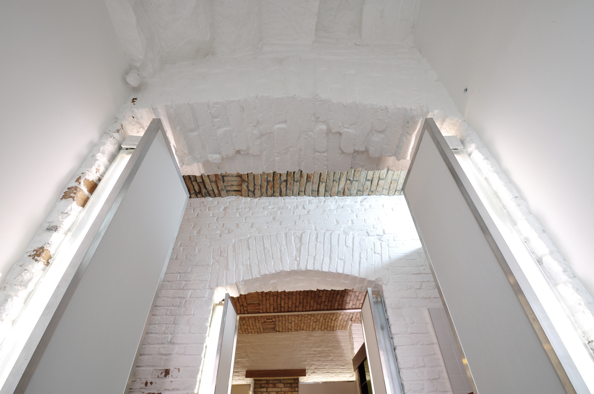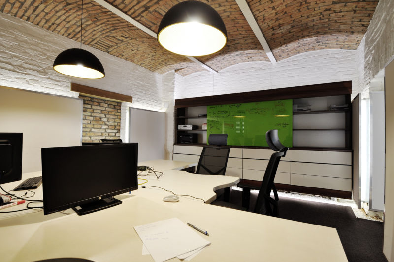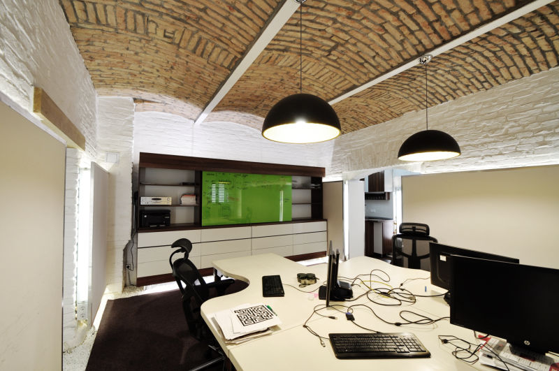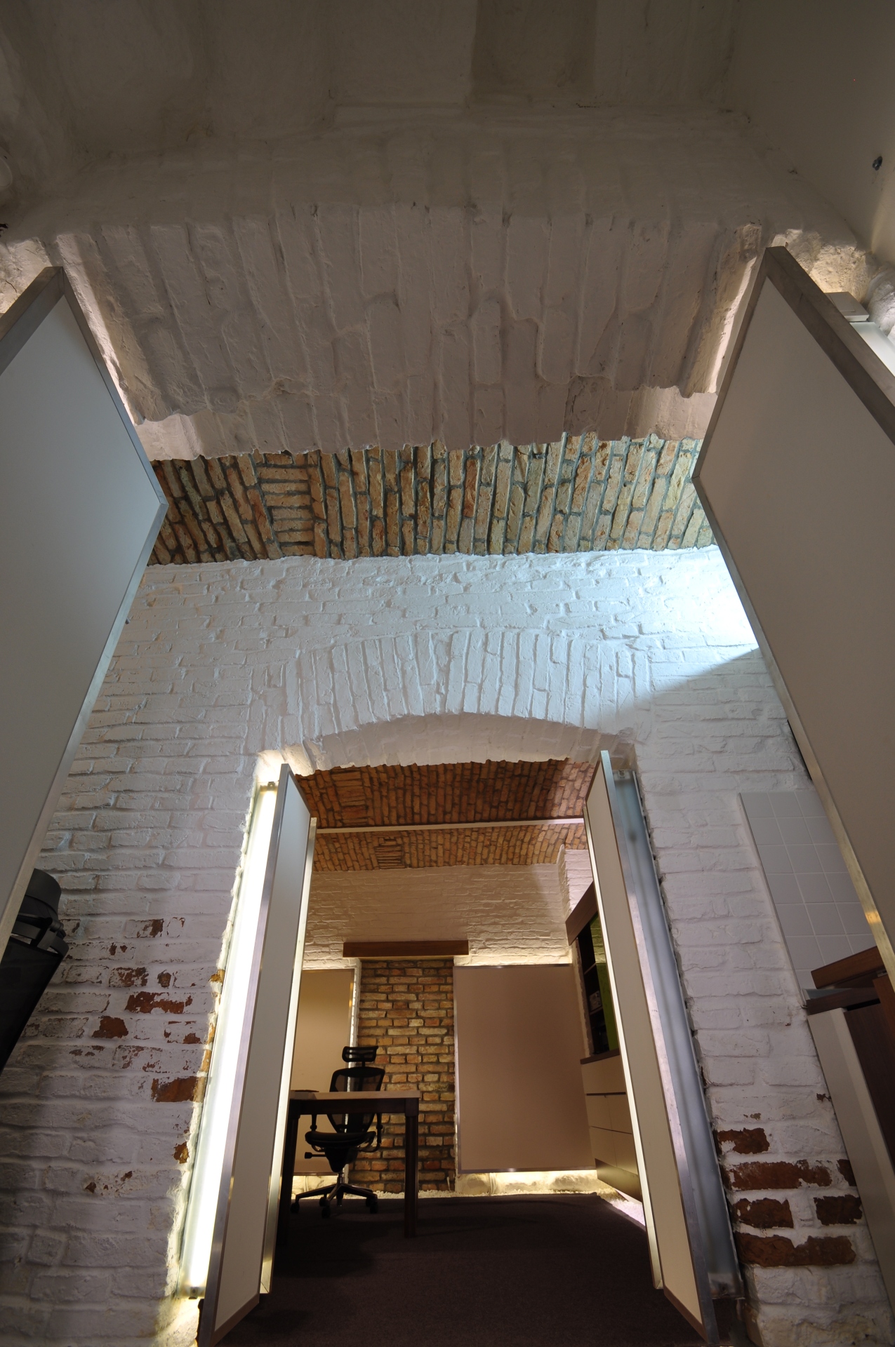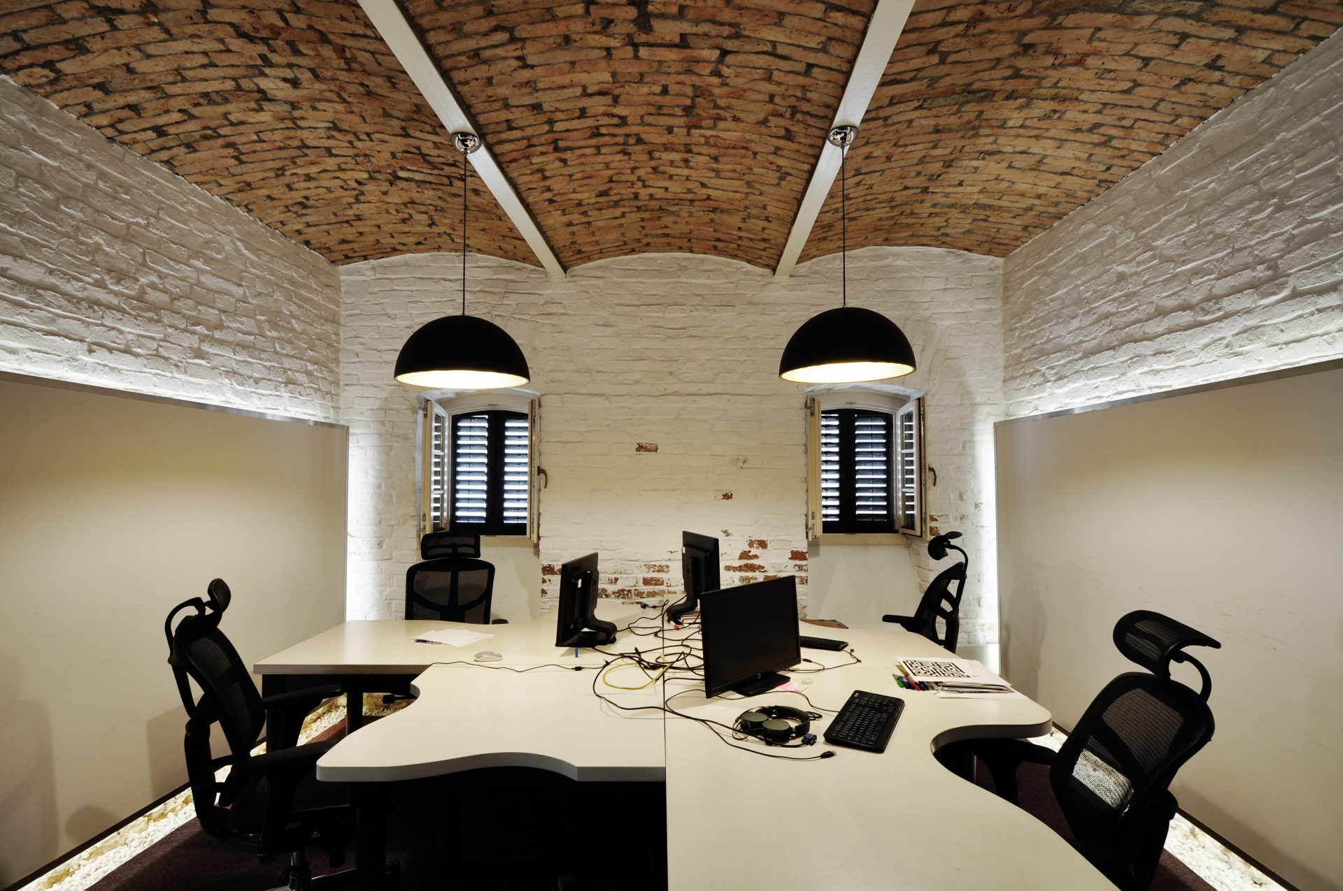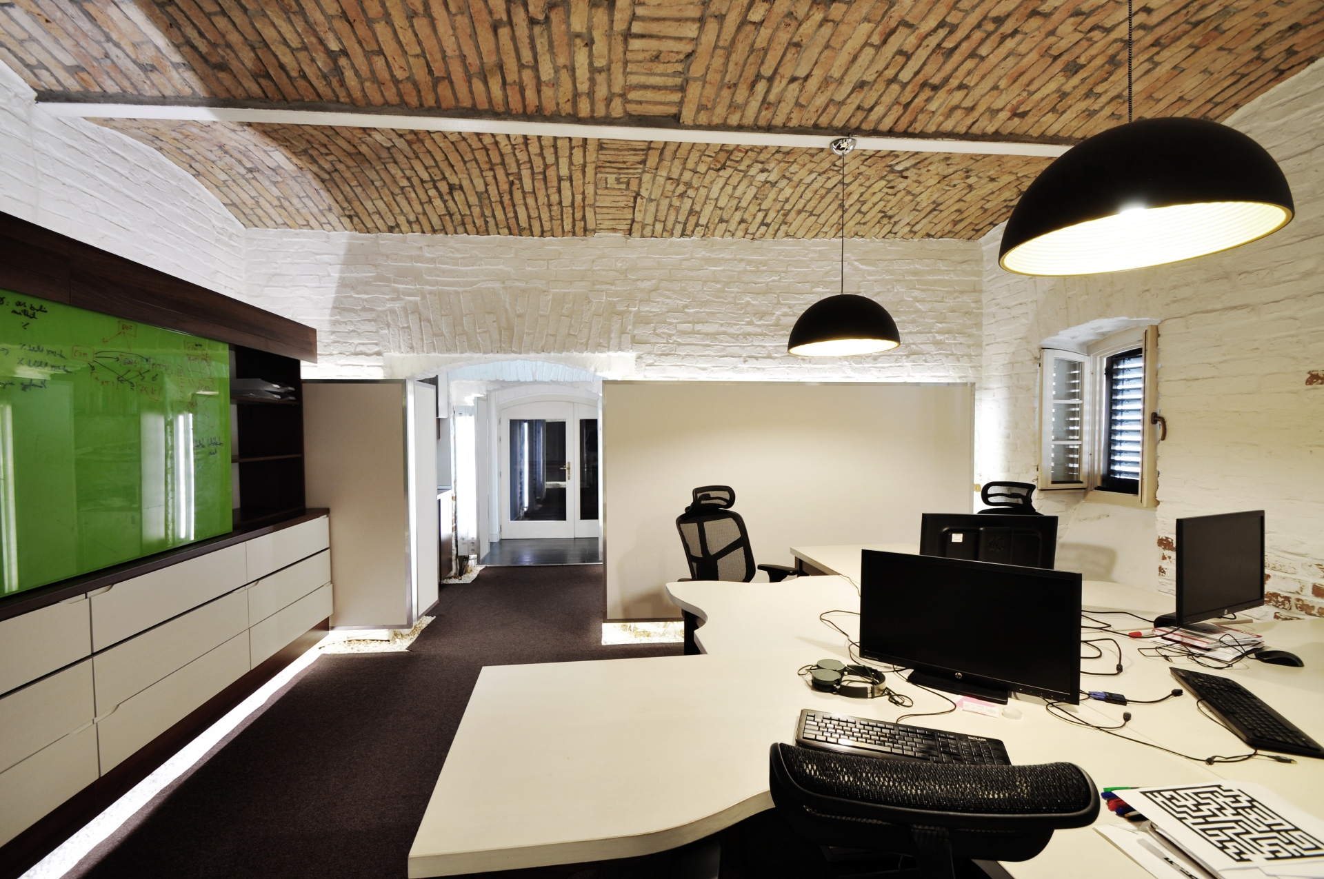 Opening towards a quiet courtyard of the old city in Székelyudvarhely, a long forgotten half-basement was waiting for someone the rediscover. It happened to be a young I.T. team that wanted to settle their office here, the older owner being satisfied by a tiny workplace under a narrow vault. Architectural surfaces and details exhibited in dimmed background light, combined with two hanging lamps seems to be suitable for the monitor-gazing workplaces. White panes of plasterboard floating in front of exposed brick walls painted in white together with a floating all-in one furniture-box makes up the whole scene. The minimal bathroom and kitchen completes the office to a fully equipped bachelor pad as an alternative usage for weekend.