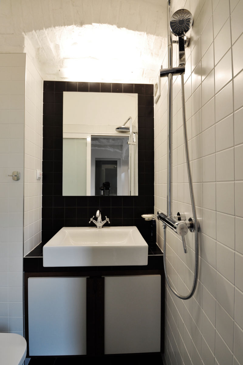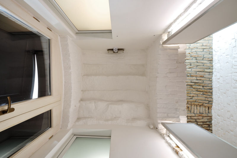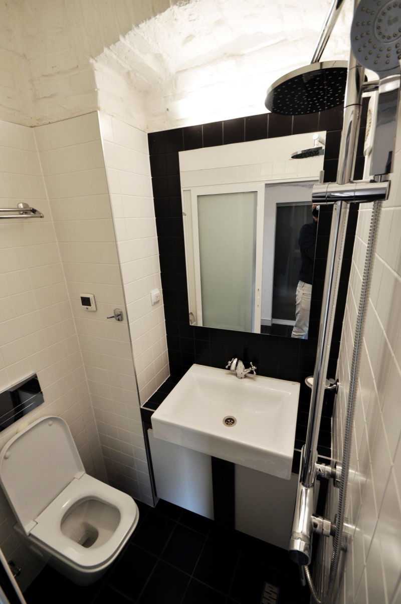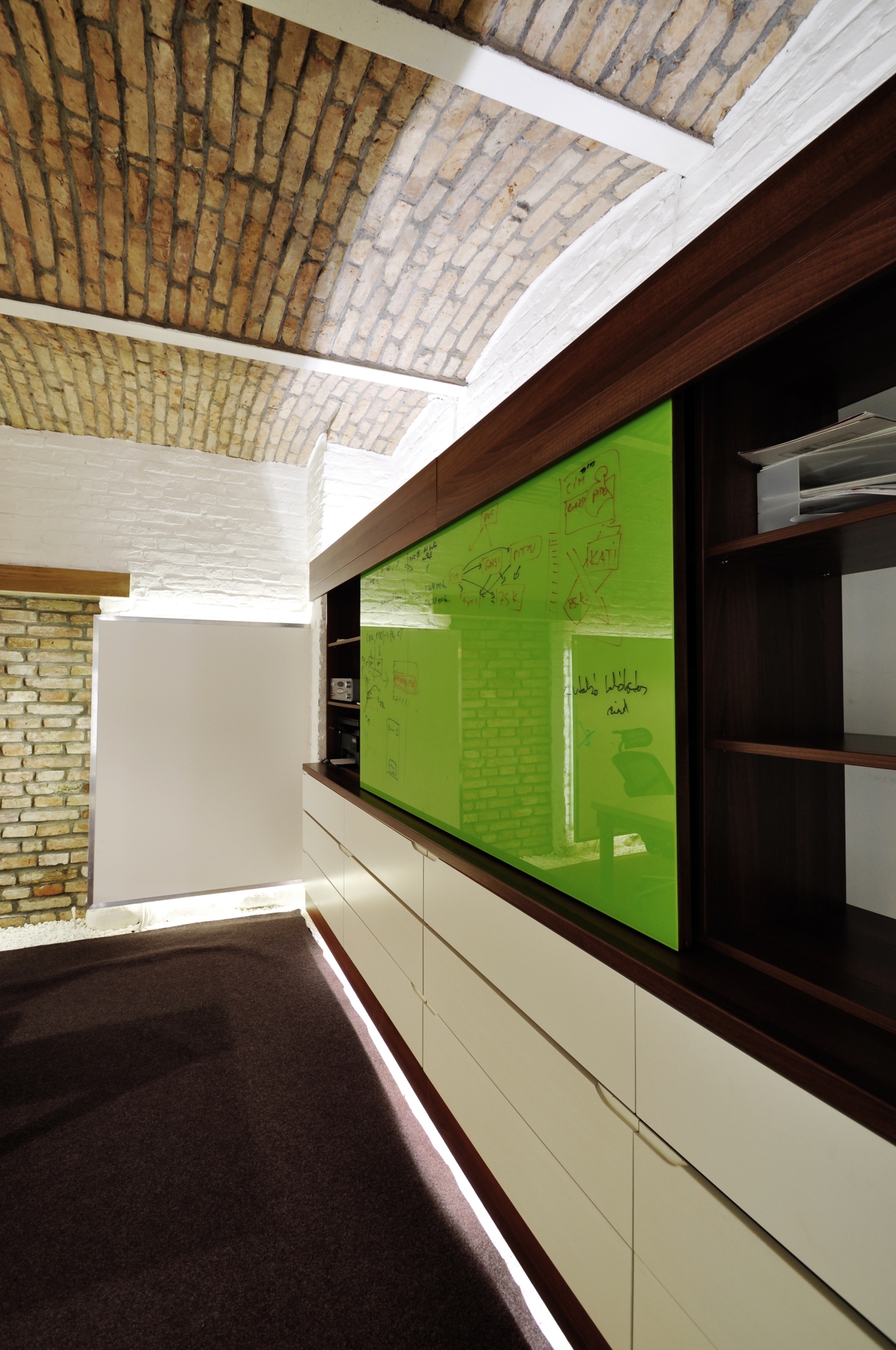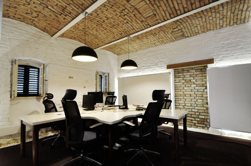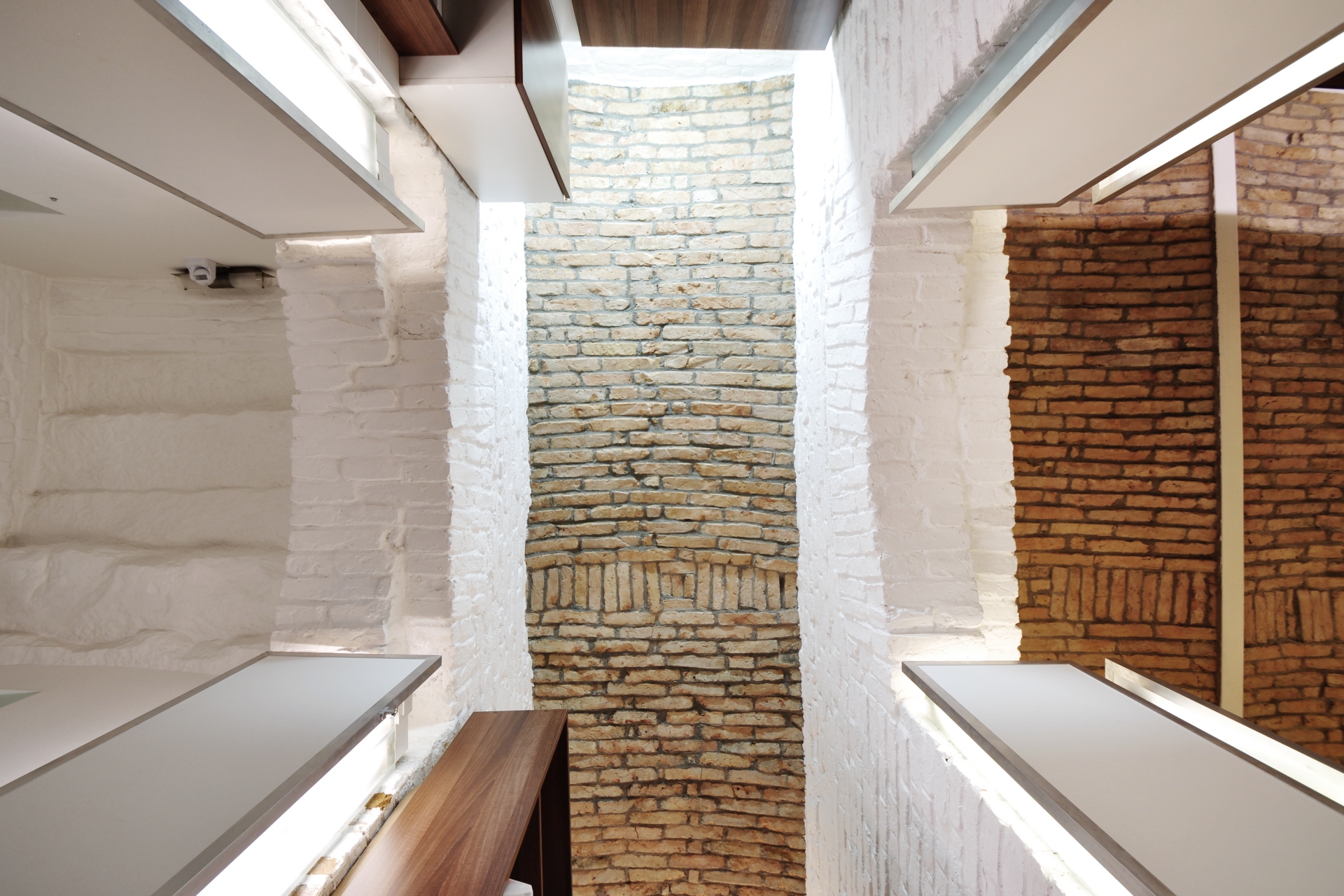 Opening towards a quiet courtyard of the old city in Székelyudvarhely, a long forgotten half-basement was waiting for someone the rediscover. It happened to be a young I.T. team that wanted to settle their office here, the older owner being satisfied by a tiny workplace under a narrow vault. Architectural surfaces and details exhibited in dimmed background light, combined with two hanging lamps seems to be suitable for the monitor-gazing workplaces. White panes of plasterboard floating in front of exposed brick walls painted in white together with a floating all-in one furniture-box makes up the whole scene. The minimal bathroom and kitchen completes the office to a fully equipped bachelor pad as an alternative usage for weekend.
